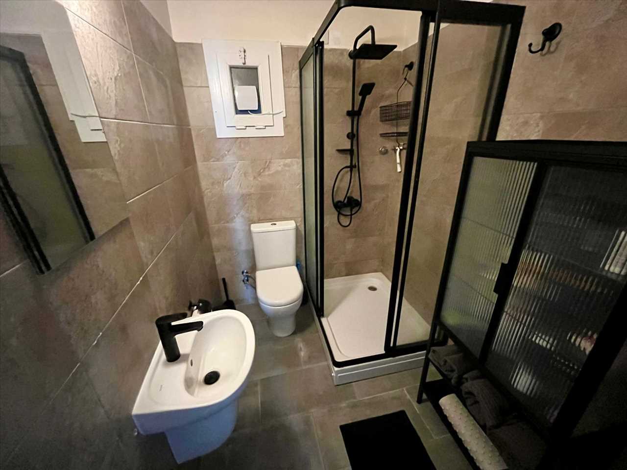 Newly renovated bathroom with ceramic floor and wall tiles, shower cabin, WC and pedestal sink with mirror above