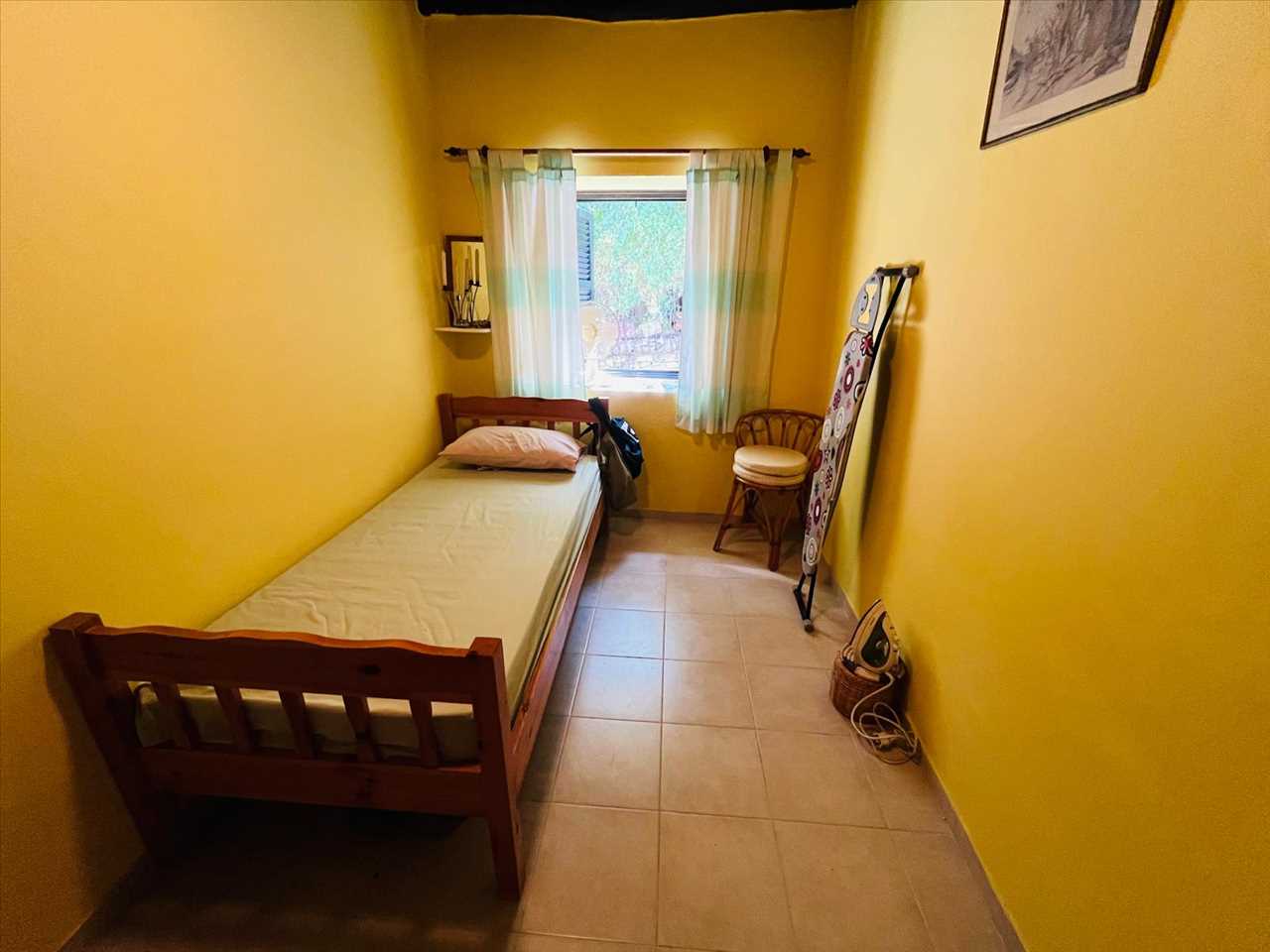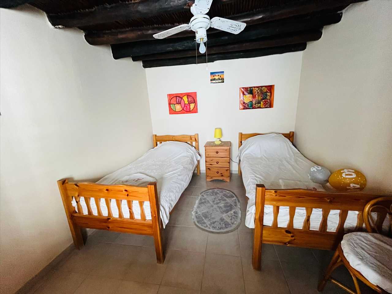 Single aspect bedroom with ceramic floors, beamed ceiling and a ceiling fan.