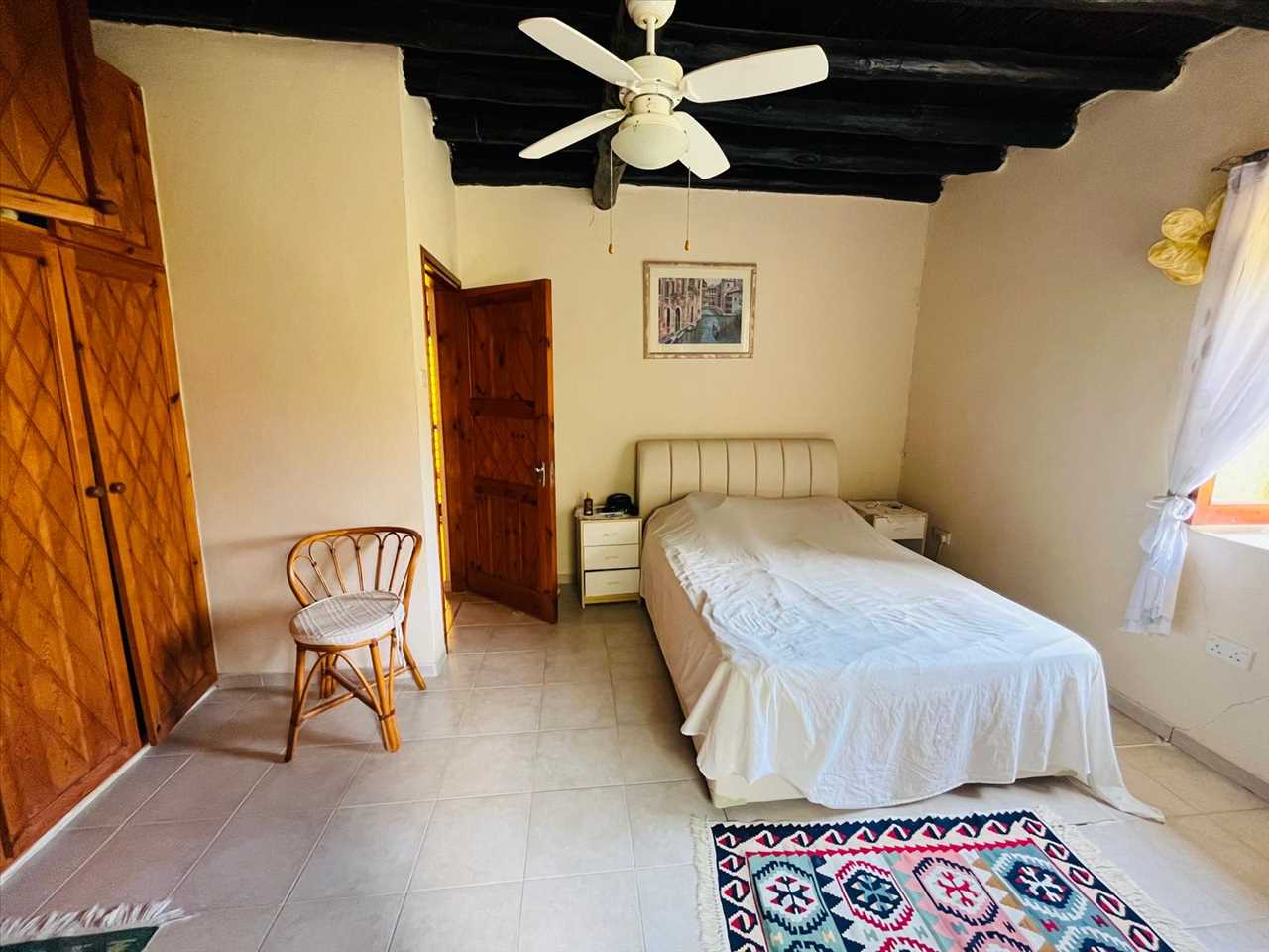 Dual aspect bedroom with ceramic floors, beamed ceiling, fitted wardrobes and a ceiling fan.