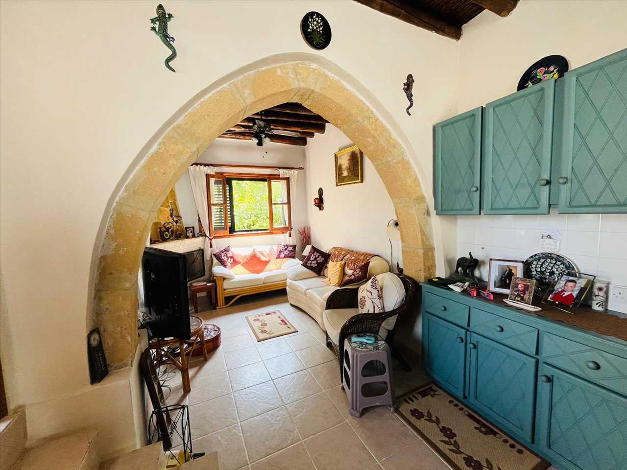 Dual aspect open plan living area with a beautiful stone arch between the kitchen and lounge, ceramic floors and beamed ceilings.