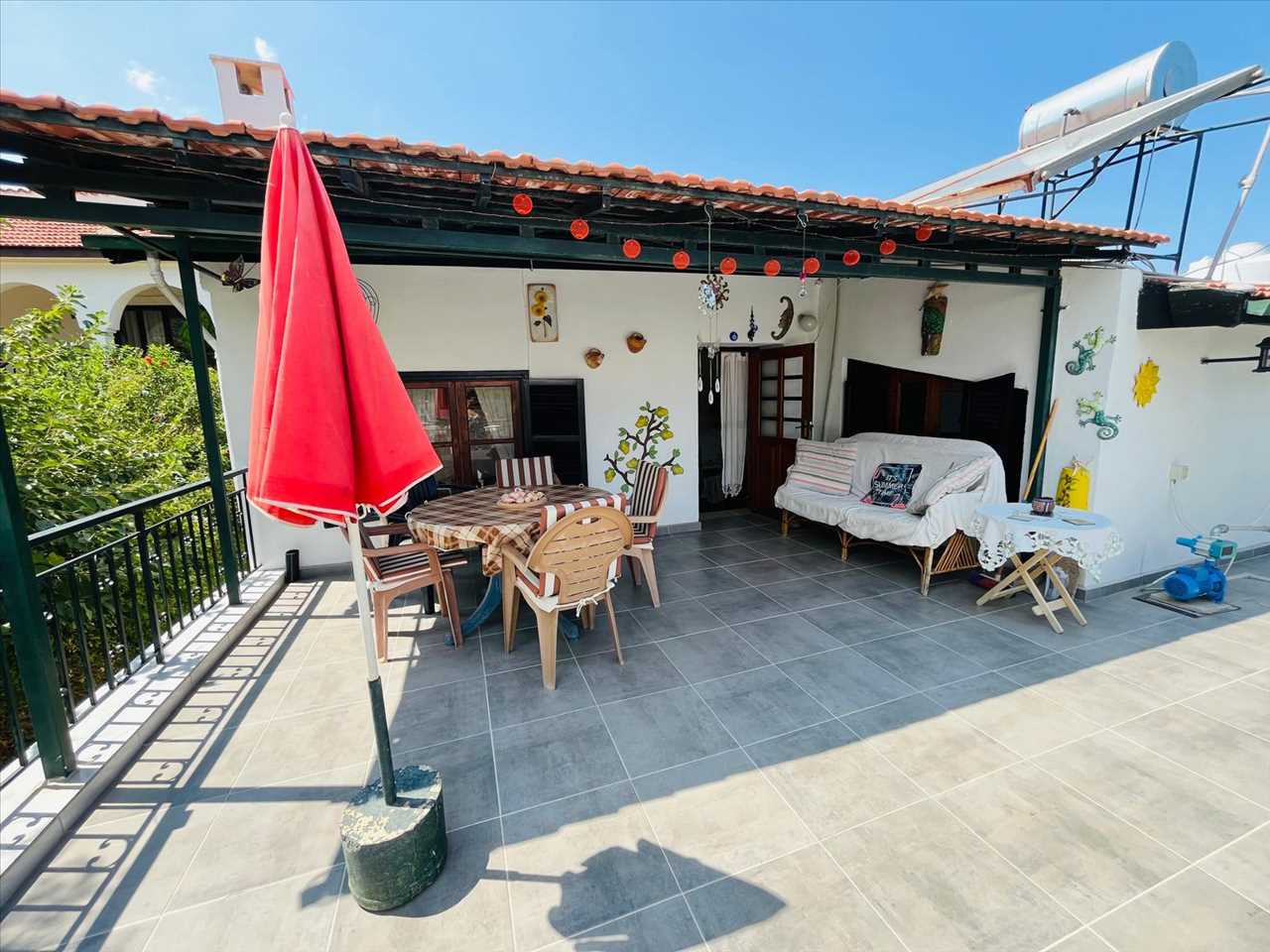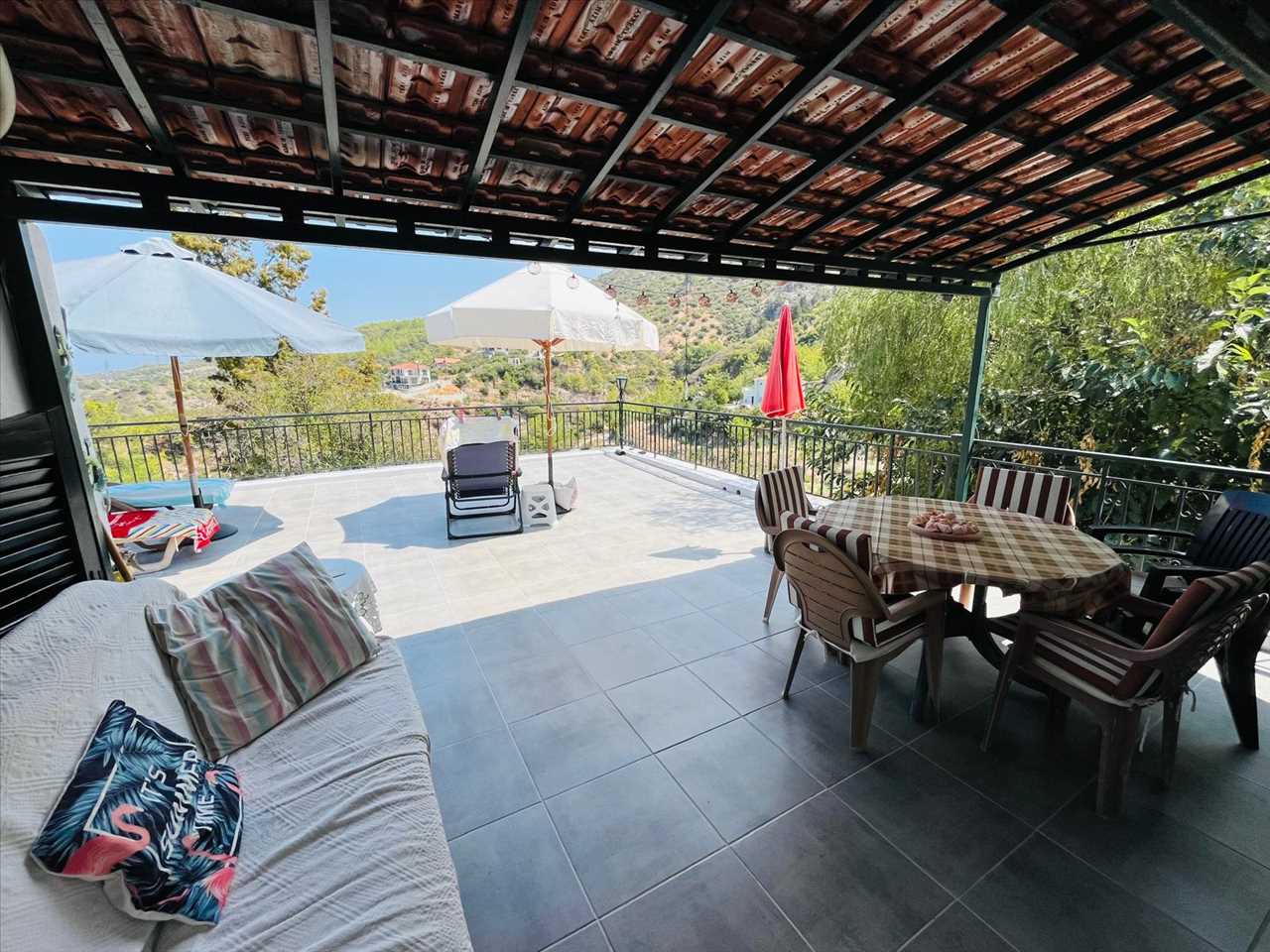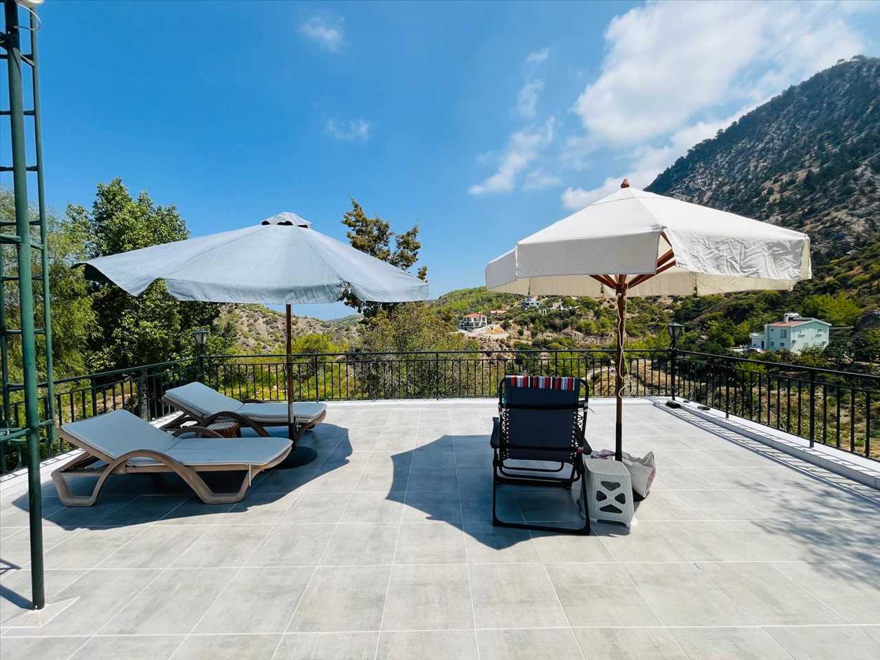 the spacious terrace offers both a covered area to cool down in the shade and a large open space for sunbathing as well as stunning views to the mountains.