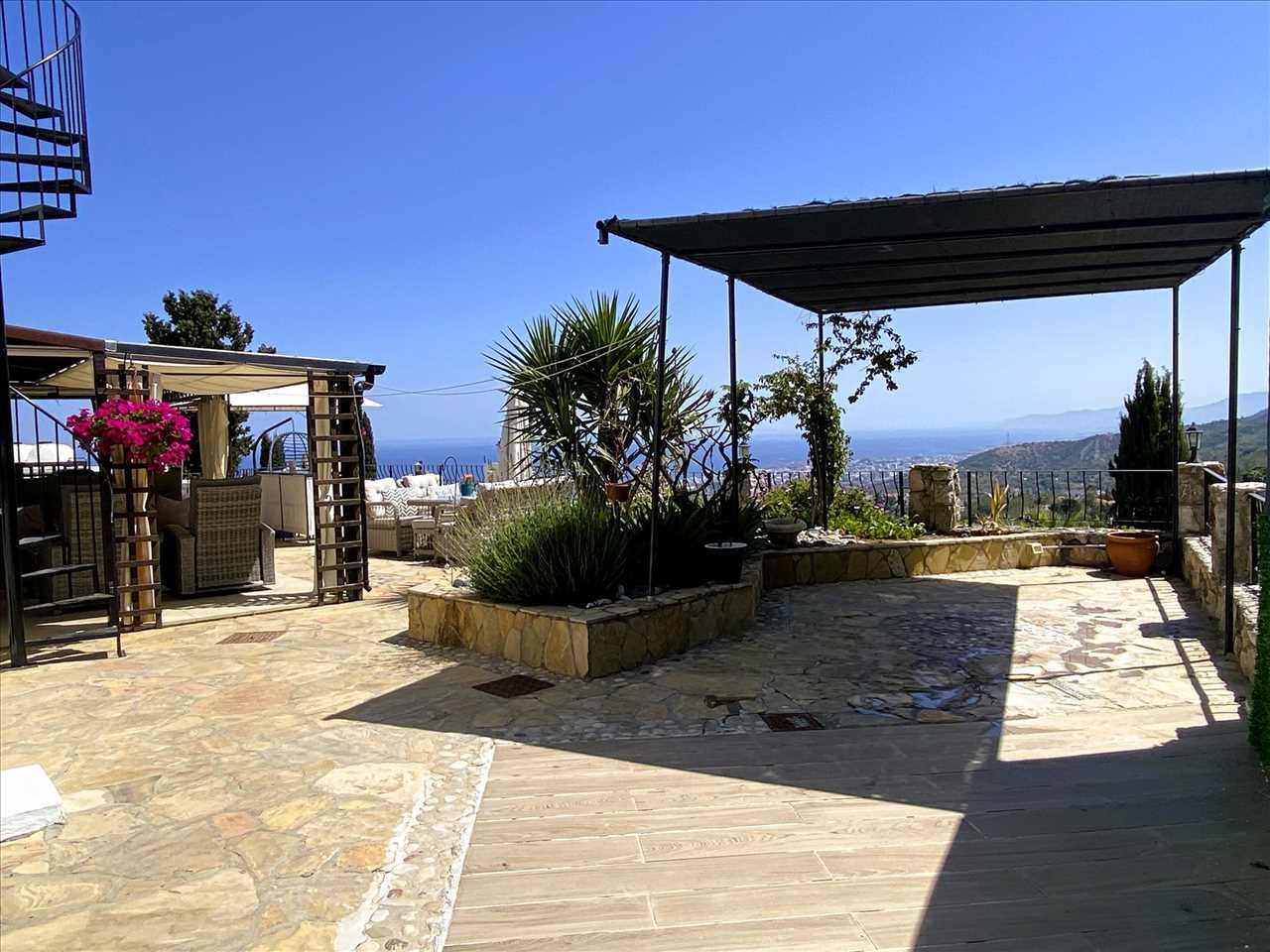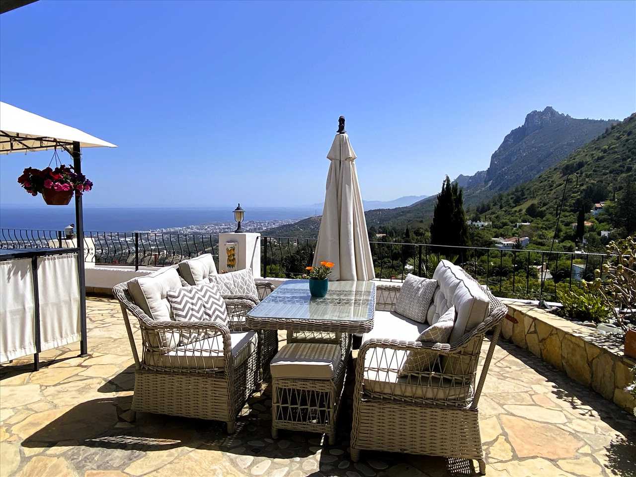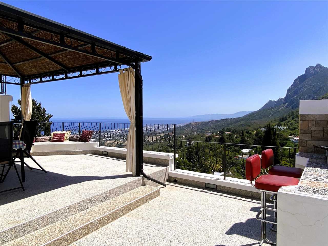 The large rear terrace offers a pergola covered dining area, open terraces with ample space for seating, access to the utility room and spectacular views to the mountains and coast.