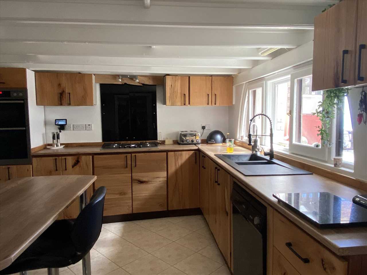 Single aspect, ceramic floor, beamed ceiling, fitted kitchen with breakfast bar, 5 ring hob and eye level double oven and grill. Fridge freezer available by separate negotiation.