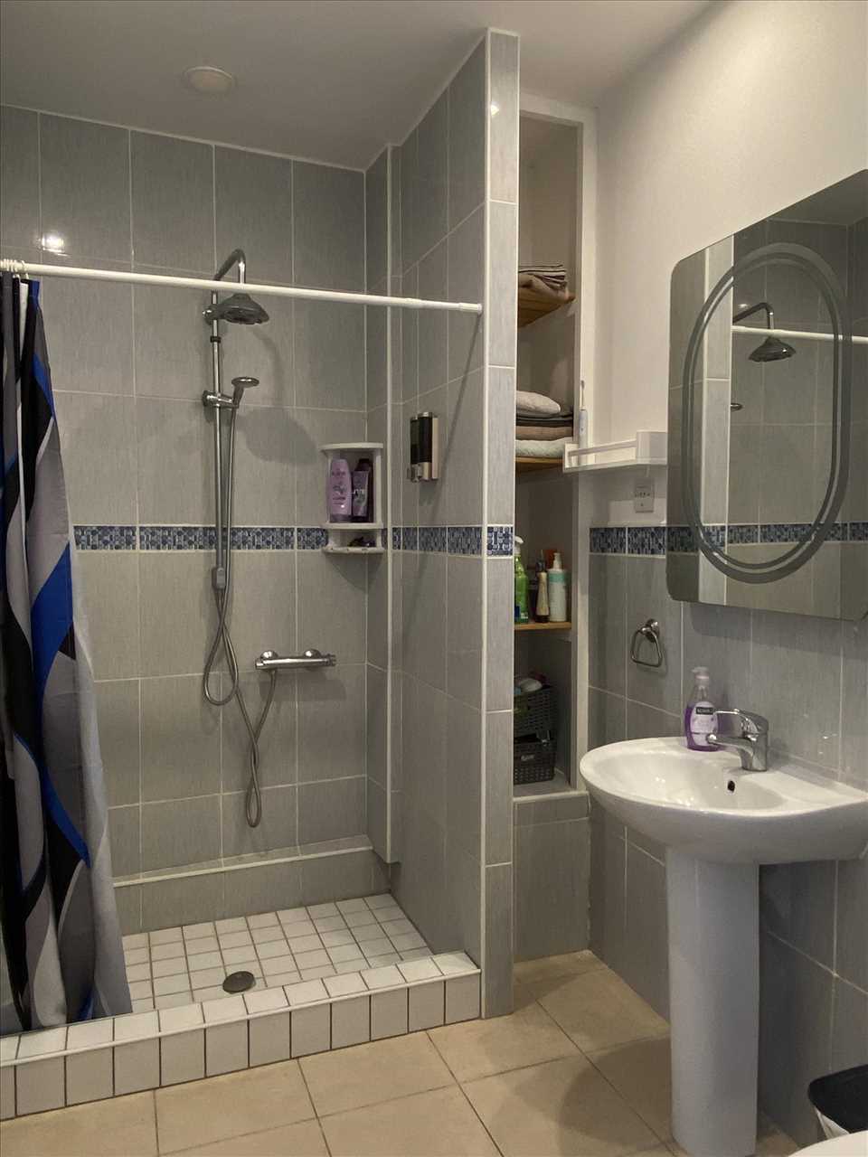 Ceramic floor and wall tiles, wc, washbasin, shower, heated towel rail and built in shelving.