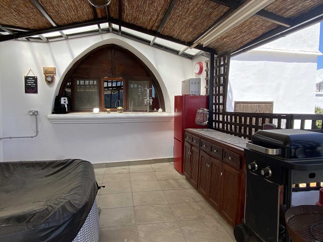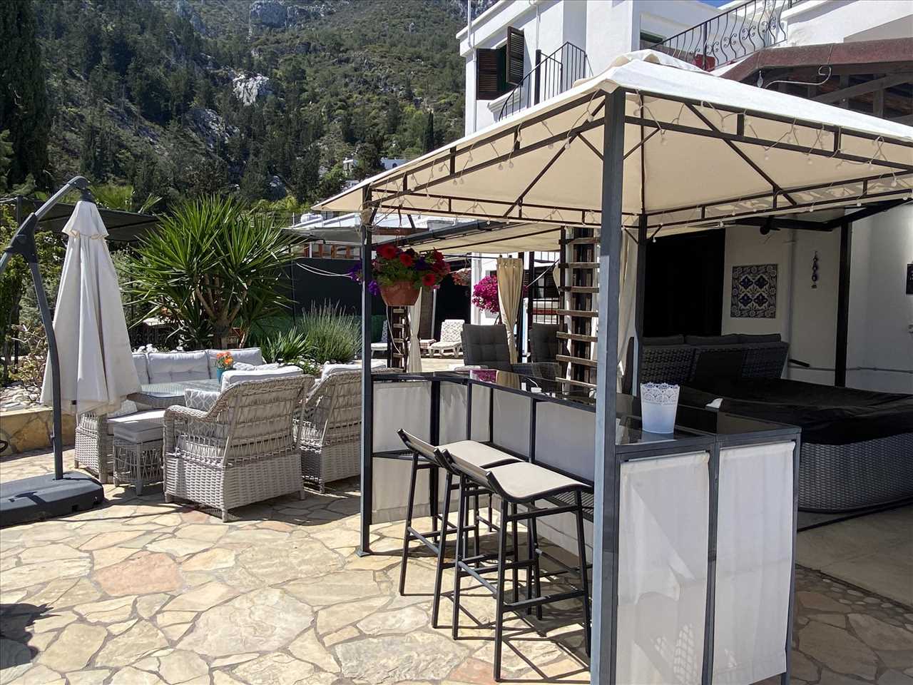 Huge terrace with outdoor kitchen, bar area, covered seating and dining areas, outdoor shower, cloakroom with wc and wash basin and staircase leading up to the guest house.