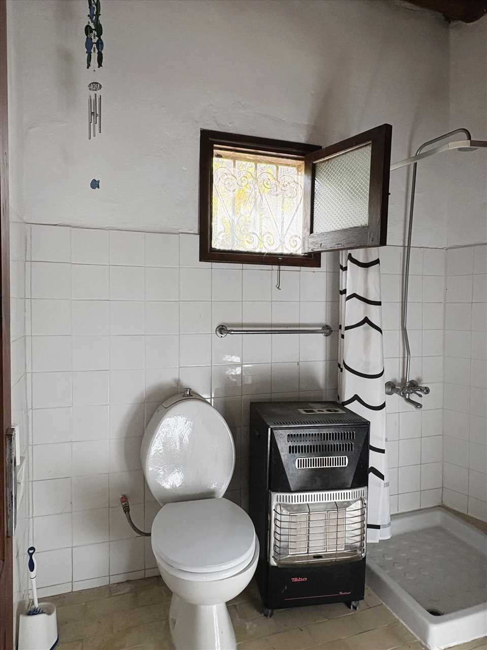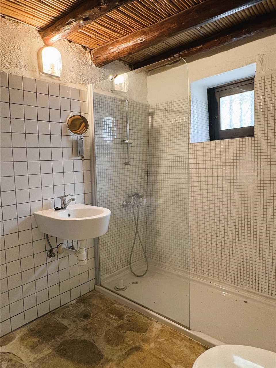 Single aspect, stone floor, ceramic wall tiles, beamed ceiling, wc. washbasin and shower with glass screen.
