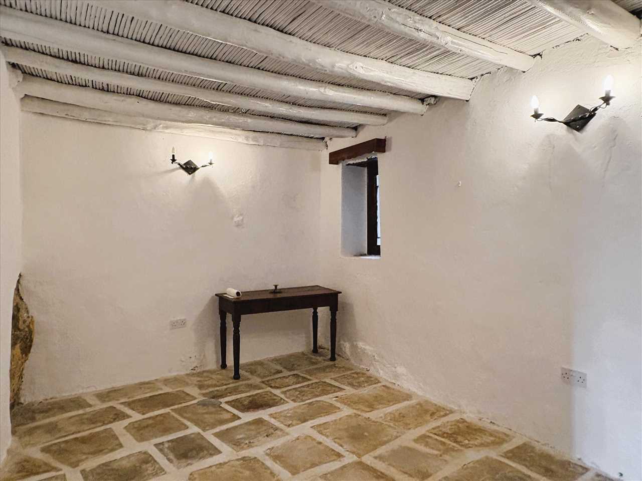 Single aspect, stone floor, beamed ceiling, wall nook with shelving and arch into the hallway.