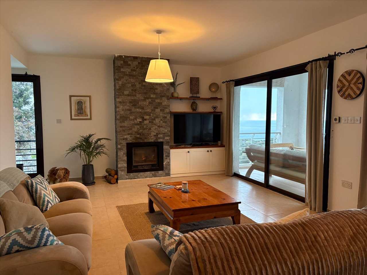 with wall of windows to large terrace, a.c, dining area, fireplace and TV